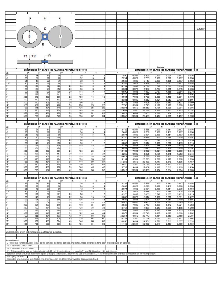 Asme B16 48 Spectacle Blind Flange Dimensions And Weight Chart